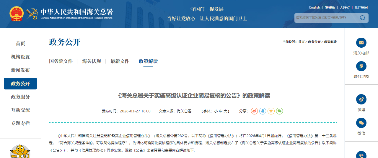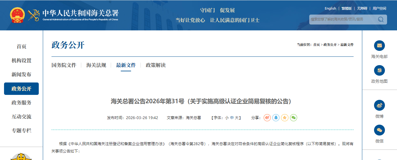 海关总署公告2026年第31号(关于实施高级认证企业简易复核的公告)