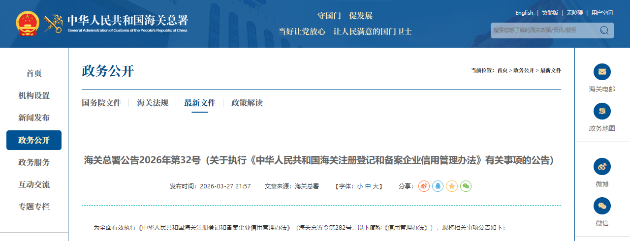 海关总署公告2026年第32号(关于执行《中华人民共和国海关注册登记和备案企业信用管理办法》有关事项的公告)