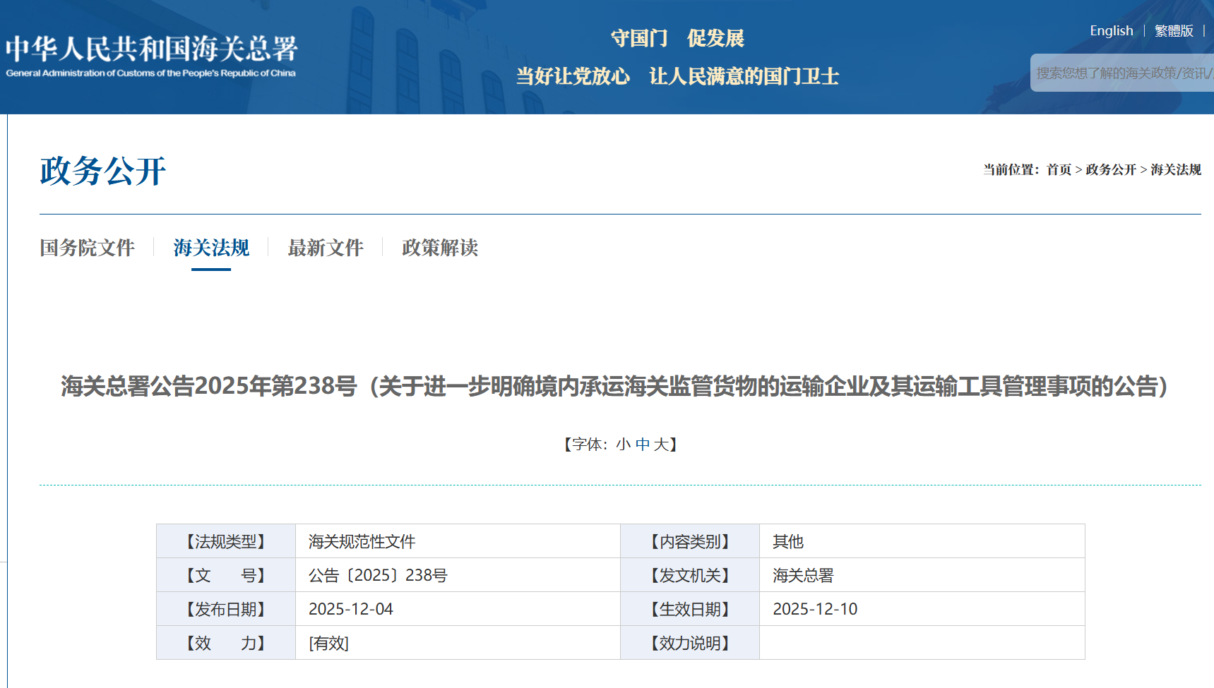 海关总署公告2025年第238号(关于进一步明确境内承运海关监管货物的运输企业及其运输工具管理事项的公告)