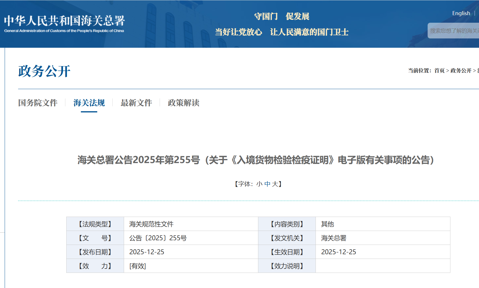 海关总署公告2025年第255号(关于《入境货物检验检疫证明》电子版有关事项的公告)