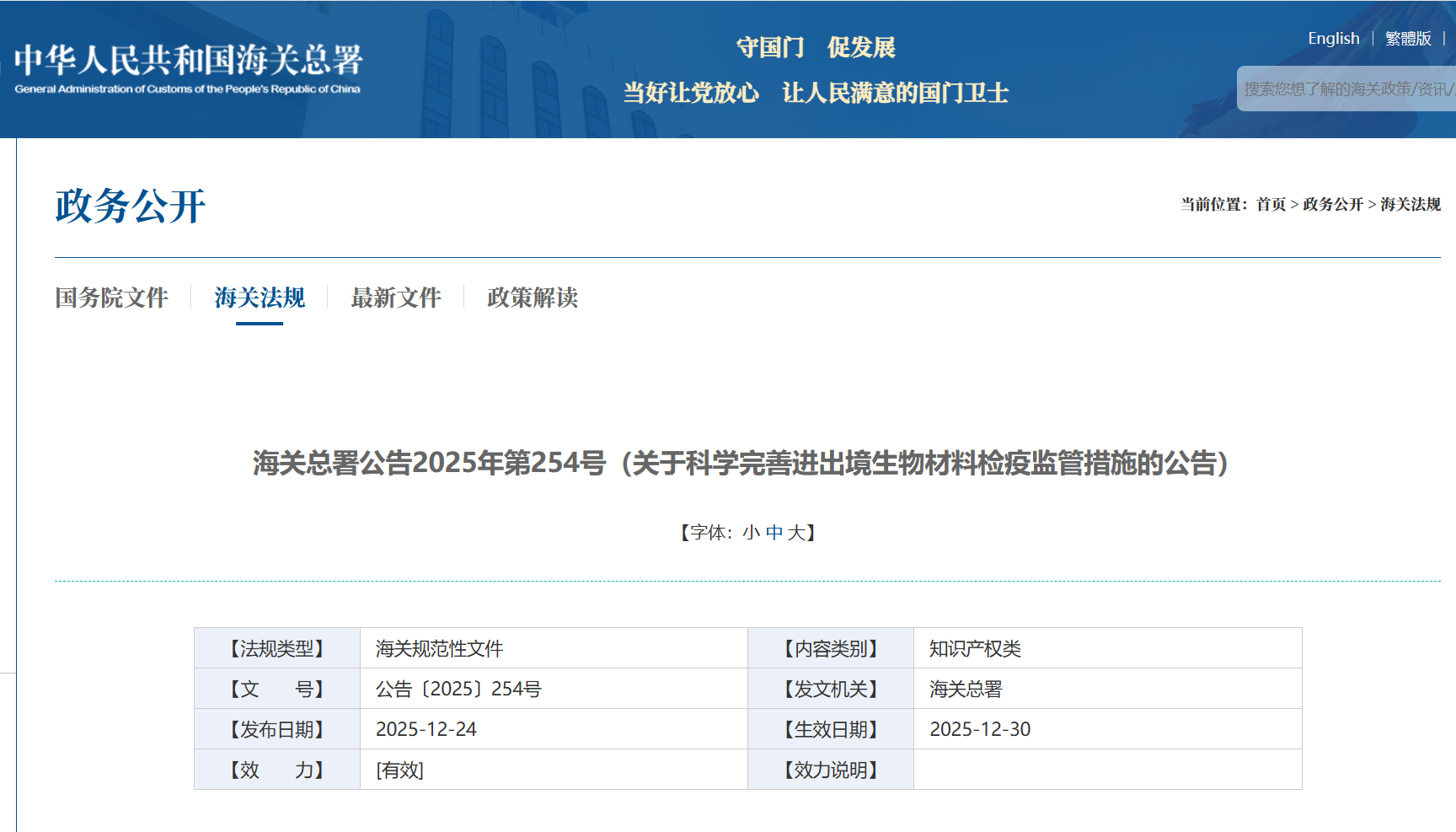 海关总署公告2025年第254号(关于科学完善进出境生物材料检疫监管措施的公告)