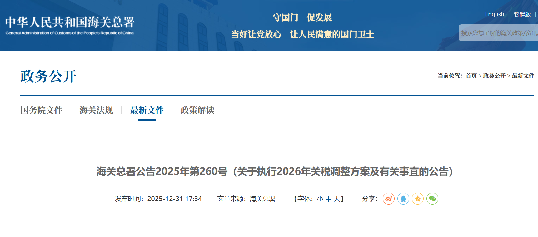 海关总署公告2025年第260号(关于执行2026年关税调整方案及有关事宜的公告)